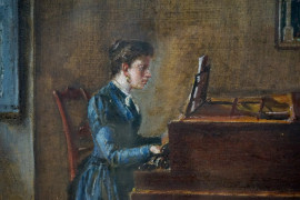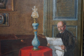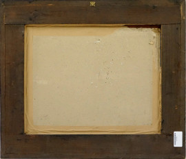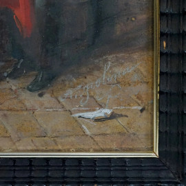 Interno con figure, tempera su carta, cm 40x51, firmato, entro cornice, (difetti).
