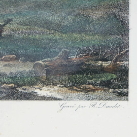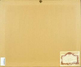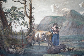 La filatrice, stampa a colori, cm 37,5x47,5, incisore R.Daudet (1737-1834), pittore K.Dujardin (1626-1678), entro cornice, (macchie sulla carta).