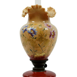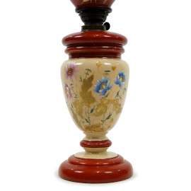 Lampada a petrolio in opalina, inizi XX secolo, decoro floreale dipinto a mano, paralume smerlato, cm h 54