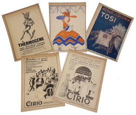 Lotto composto da cinque locandine dei primi del Novecento con stampa fronte e retro di pubblicità d’epoca, ciascuna circa cm 23x18