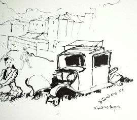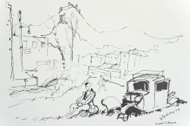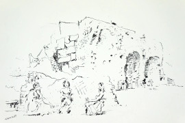 Lotto composto da otto stampe raffiguranti scorci di paesi con figure, cm 35,5x25, firmate