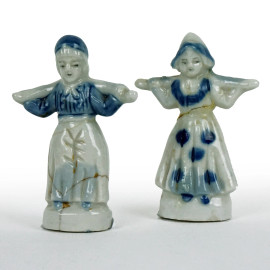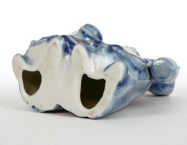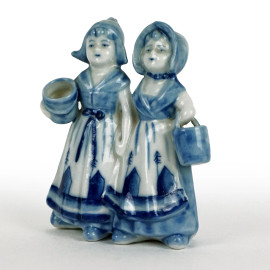 Lotto composto da tre sculture in porcellana bianca e blu raffiguranti contadine, cm h 11, XX secolo, (difetti).