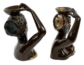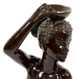 Lotto di due sculture in ceramica raffiguranti busti di donne africane, particolari dorati, cm h 35, XX secolo, (difetti).