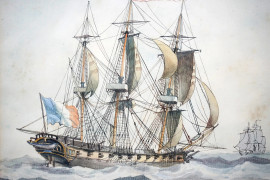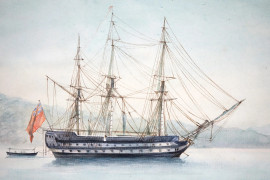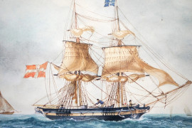 Lotto di tre acquarelli raffiguranti navi, cm 17x24, firmati Noel, entro cornici.