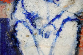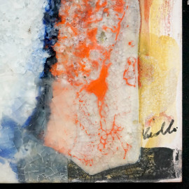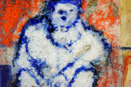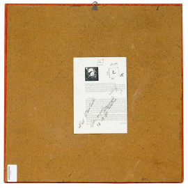 Figura seduta, placca in ceramica invetriata policroma, cm 33,5x33,5, entro cornice.