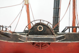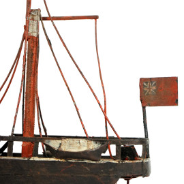 Modellino di veliero in latta dipinta, cm 26x38, XX secolo, (difetti).