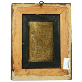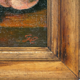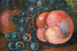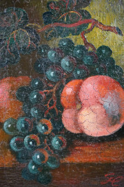 Natura morta, uva e pesca, olio su tela, cm 27x19, siglato, entro cornice.