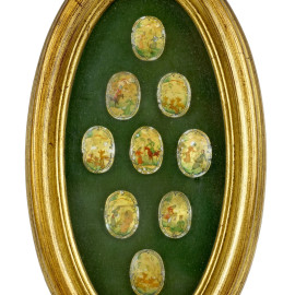 Nove miniature persiane in madreperla raffiguranti scene di genere, entro un'unica cornice, misure ingombro cm 21x12.