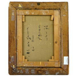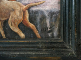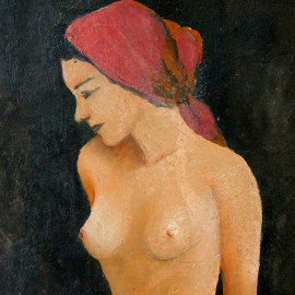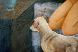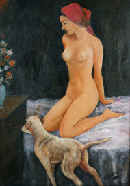 Nudo di donna con cane, olio su tela, cm 30x40, firmato, entro cornice.