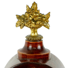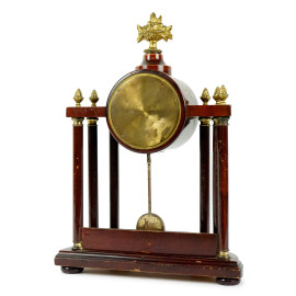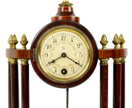 Orologio a tempietto in legno tinto a noce, finiture in bronzo, cm h 29,5, prima metà XX secolo, (difetti, meccanismo da revisionare).
