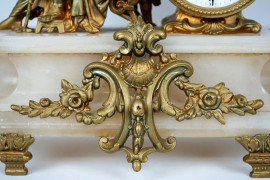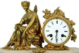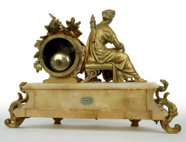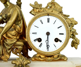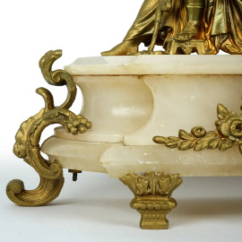 Orologio da camino con scultura di Diana cacciatrice, XIX secolo, in metallo dorato, quadrante a numeri romani, base in alabastro, ingombro totale cm 29x39x10, (meccanismo da revisionare).