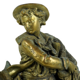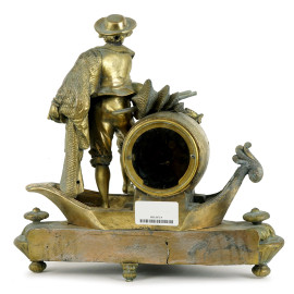 Orologio da camino in metallo dorato sormontato da fanciullo, prima metà XX secolo, cm h 36,5, (difetti, meccanismo da revisionare).