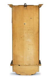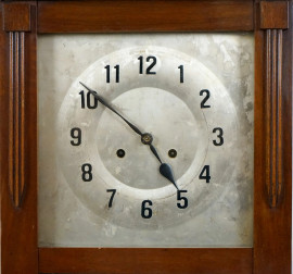 Orologio da muro in noce, XX secolo, quadrante in metallo argentato a numeri arabi, cm h 71x37x19, (difetti, meccanismo da revisionare).