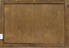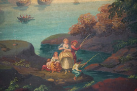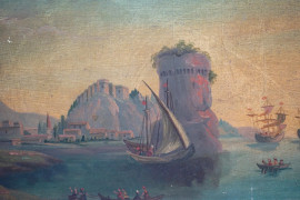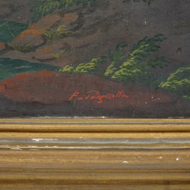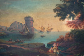 Paesaggio costiero con castello e figure, olio su tavoletta, cm 44,5x68,5, firmato, entro cornice.