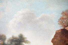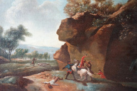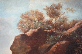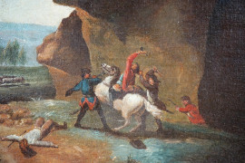 Pittore Francese, fine XVIII - inizio XIX Secolo, Paesaggio con briganti, olio su cartone telato, cm 28x38, entro cornice