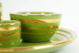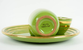 Quattro oggetti da scrivania in ceramica smaltata verde, finiture dorate, manifattura Alfa, XX secolo, diam. cm 25