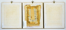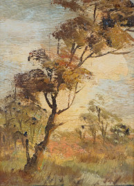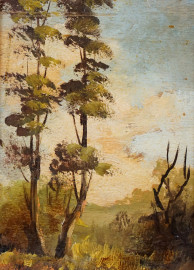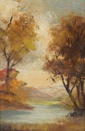 Scorci di paesaggi lacustri, tre dipinti ad olio su compensato, cm 14,4x9,5, XX secolo, entro cornici.