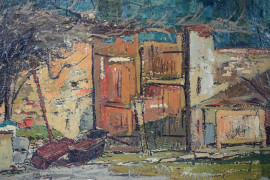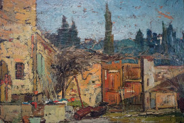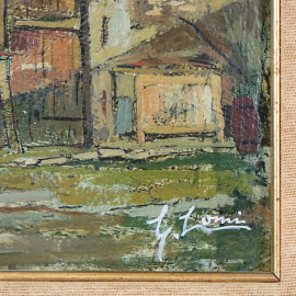 Scorcio di borgo toscano, olio su cartone, cm 26,5x35, firmato G.Lomi, etro cornice.