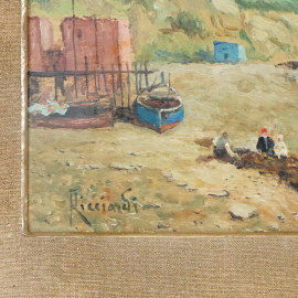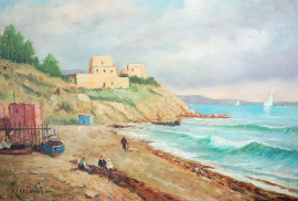 Scorcio di costa, olio su compensato, cm 20x28, firmato, entro cornice.