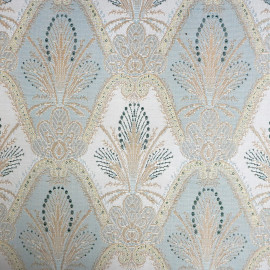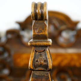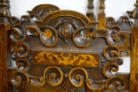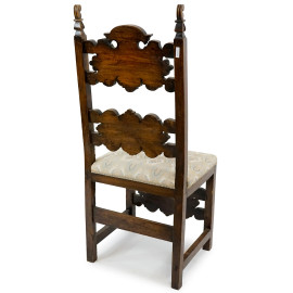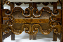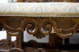 Sei sedie in noce, XIX secolo, particolari scolpiti ed intagliati, sedute in stoffa ricamata beige, cm h 116, (difetti).