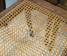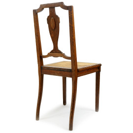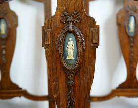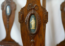 Sei sedie in rovere, inizi XX secolo, cartelle a giorno scolpite ed intagliate, decorate con applicazioni di placchette in porcellana raffiguranti figure neoclassiche, seduta in paglia di Vienna, gambe anteriori troncoconiche scanalate, gambe posteriori mosse, cm h 95, (difetti).