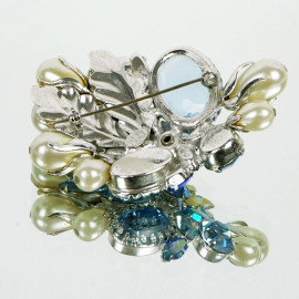 Spilla con pietre in vetro azzurro e finte perle, marcata Regency, cm 7x5, (difetti).