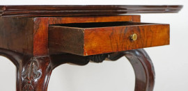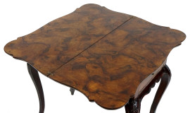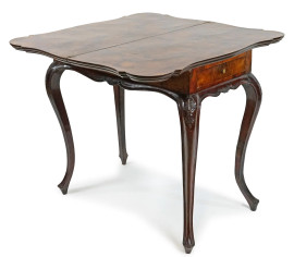 Tavolo consolle uso gioco in noce e radica di noce, XX secolo, piano di linea sagomata, un cassetto laterale, quattro gambe mosse (una gamba rotta), cm h 79x42x83 (piano aperto cm 84)