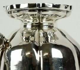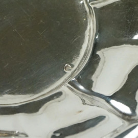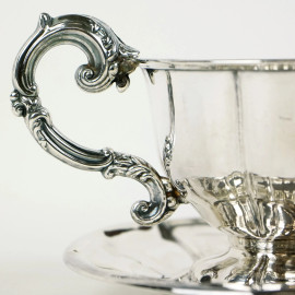Tazzina con piattino in metallo argentato, presa a voluta, dimensioni tazzina cm 8x11,5, diametro piattino cm 13, XX secolo