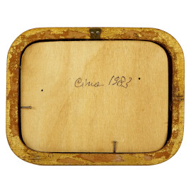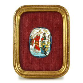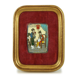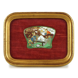Tre placchette in smalti cloisonnè raffiguranti scene di genere, Cina, XX secolo, cm 6x4,5, entro cornici