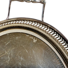 Vassoio di linea ovale in argento, bordo a ringhierina, due prese laterali, cm h 5x35,5x22, gr 494