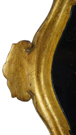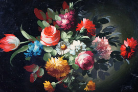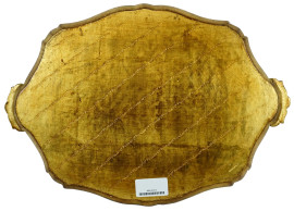 Vassoio in legno dorato e dipinto, bordo mistilineo con corte prese laterali, decoro centrale raffigurante bouquet di fiori, cm 52x36,5, XX secolo