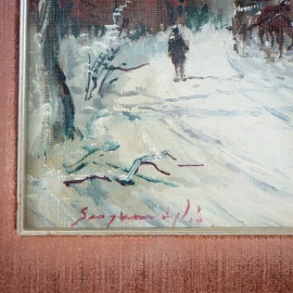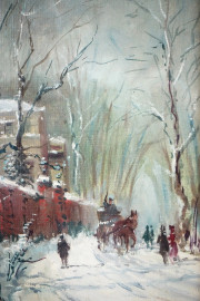 Viale innevato con carrozza, olio su cartone telato, 23x13,5, firmato, entro cornice.