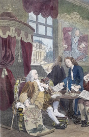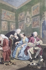 William Hogarth (1697-1764), Marriage alla mode - Plate 1, dis. W. Hogarth, engraved T.Cook, antica incisione acquarellata, cm 50x60