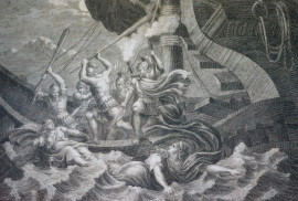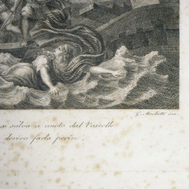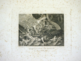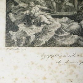 Antica incisione raffigurante Agrippina si salva a nuoto dal Vascello che doveva farla perire, cm 27x38, incisore Mochetti, inventore Pinelli (1781-1835), entro cornice in radica, (macchie sulla carta).