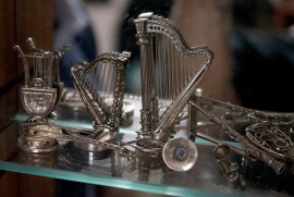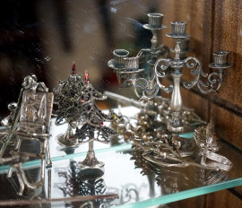 Bacheca in noce contenente varie microfusioni in argento e metallo argentato, misure bacheca cm 68x34x10, peso netto argento gr 795