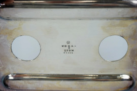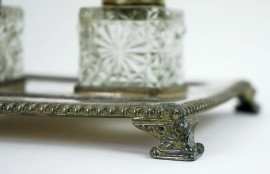 Calamaio in metallo argentato a due vaschette in cristallo controtagliato, cm h8,5x22,5x18,5, marca sotto la base, (difetti)