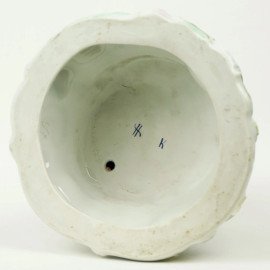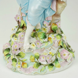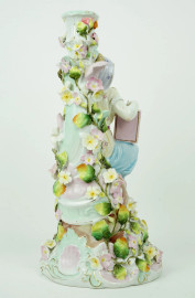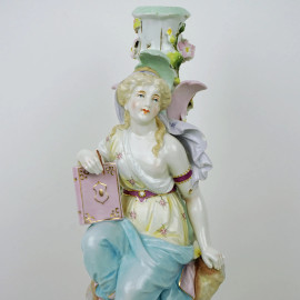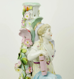 Candeliere in porcellana policroma raffigurante figura femminile seduta con libro, cm h 32,5, marchio alla base, (difetti e restauri).