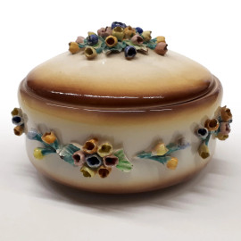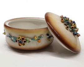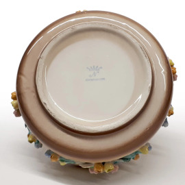 Centrotavola in porcellana policroma Capodimonte con decori floreali a rilievo, diametro cm 20