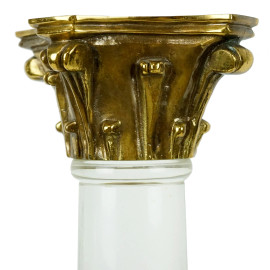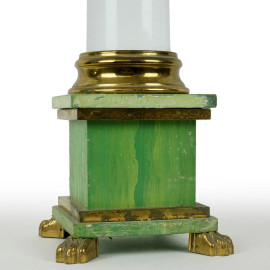 Colonna in plexiglass con finiture in bronzo, base in legno dipinto a finto marmo, poggiante su quattro piedi ferini, cm h 54,5, XX secolo.