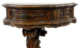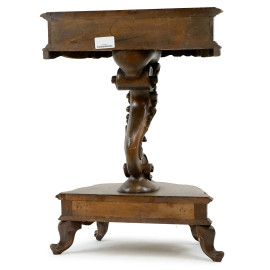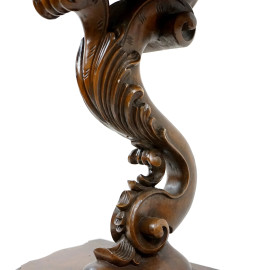 Comodino in noce, inizi XX secolo, piano di linea sagomata, un cassetto nella fascia, gamba a volute e grande foglia d'acanto, base ad un cassetto poggiante su quattro piedi a ricciolo, cm h 70x53x29