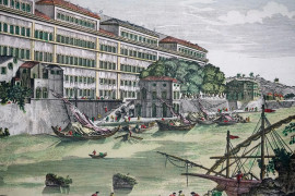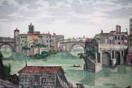 Coppia di incisioni acquerellate del XVIII secolo raffiguranti il Ponte Rotto, il Ponte dei Quattro Capi e la veduta del Porto di Ripa Grande a Roma, cm 32x42, entro cornici.