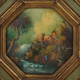 Coppia di miniature raffiguranti paesaggi, olio su rame, cm 9x9, firmate, entro cornici ottagonali