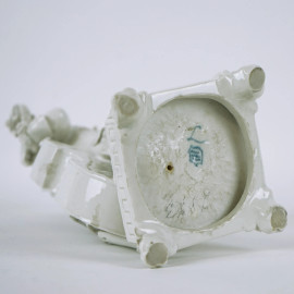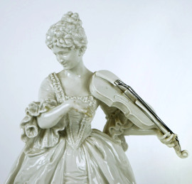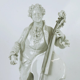 Coppia di sculture in porcellana bianca raffiguranti musicisti, alt. max cm 30,5, marchi alla base, (difetti e restauri).