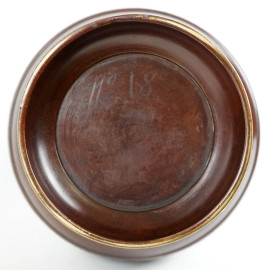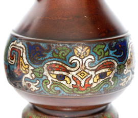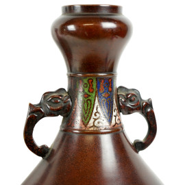 Coppia di vasi in bronzo e smalti cloisonné, corpo decorato a tre fasce con intrecci floreali e motivi arcaicizzanti, anse zoomorfe, cm h 31, Cina, XX secolo.