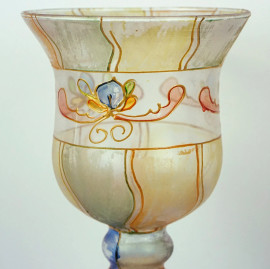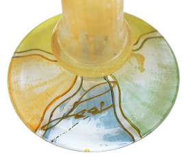 Coppia di vasi in vetro dipinto a mano, cm h 35 circa, firmati, (segni del tempo)