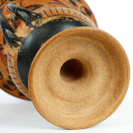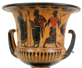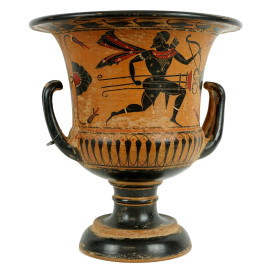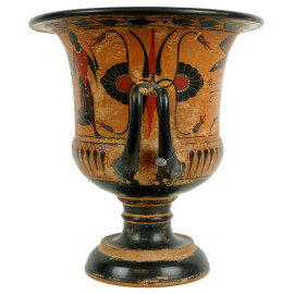Cratere a calice in terracotta, ampio orlo svasato, corpo con decoro a figure nere e rosse raffiguranti personaggi maschili e femminili, cm h 30,5, riproduzione del XX secolo, (difetti).