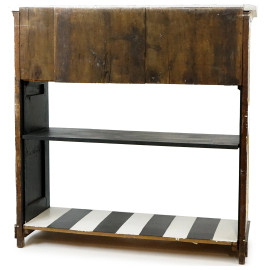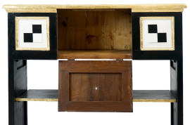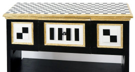 Credenza funky in legno dipinto in bianco e nero con particolari dorati, fronte ad uno sportello a calatoia ed un ripiano, cm h 91x93x29.