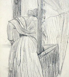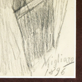 Donna al balcone, carboncino su carta, cm 21x13, firmato Migliaro