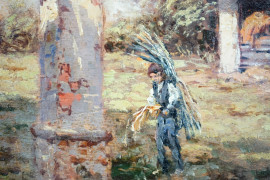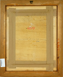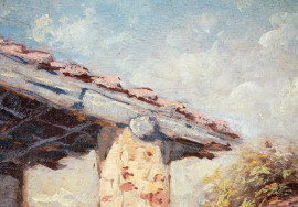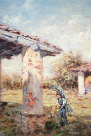 Esterno di fattoria con figura, olio su tavola, cm 35x25, firmato Domincis, entro cornice.