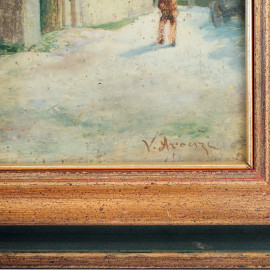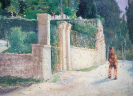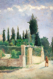 Esterno di parco con figura, olio su cartone, cm 32x24, firmato, entro cornice.